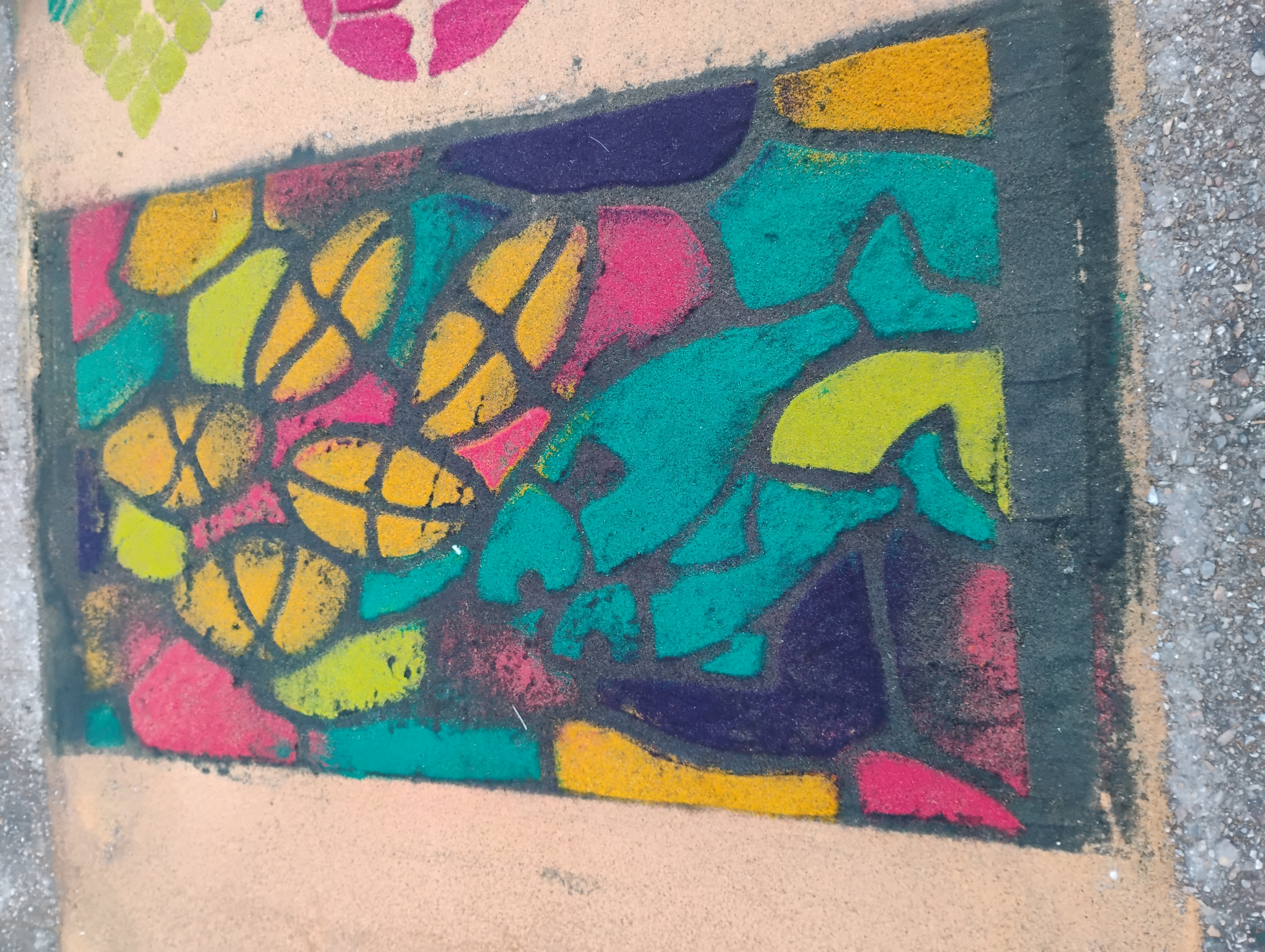Alfombras sawdust tapestries are a centuries old tradition - an artistic and religious expression of gratitude for blessings throughout the year brought from Spain to the Americas. They are created with sawdust laid directly on the streets for a church procession that happens on Good Friday leading up to Easter. Many hours are required to create the tapestries that disappear under the footsteps of the religious procession only hours after they have been created.