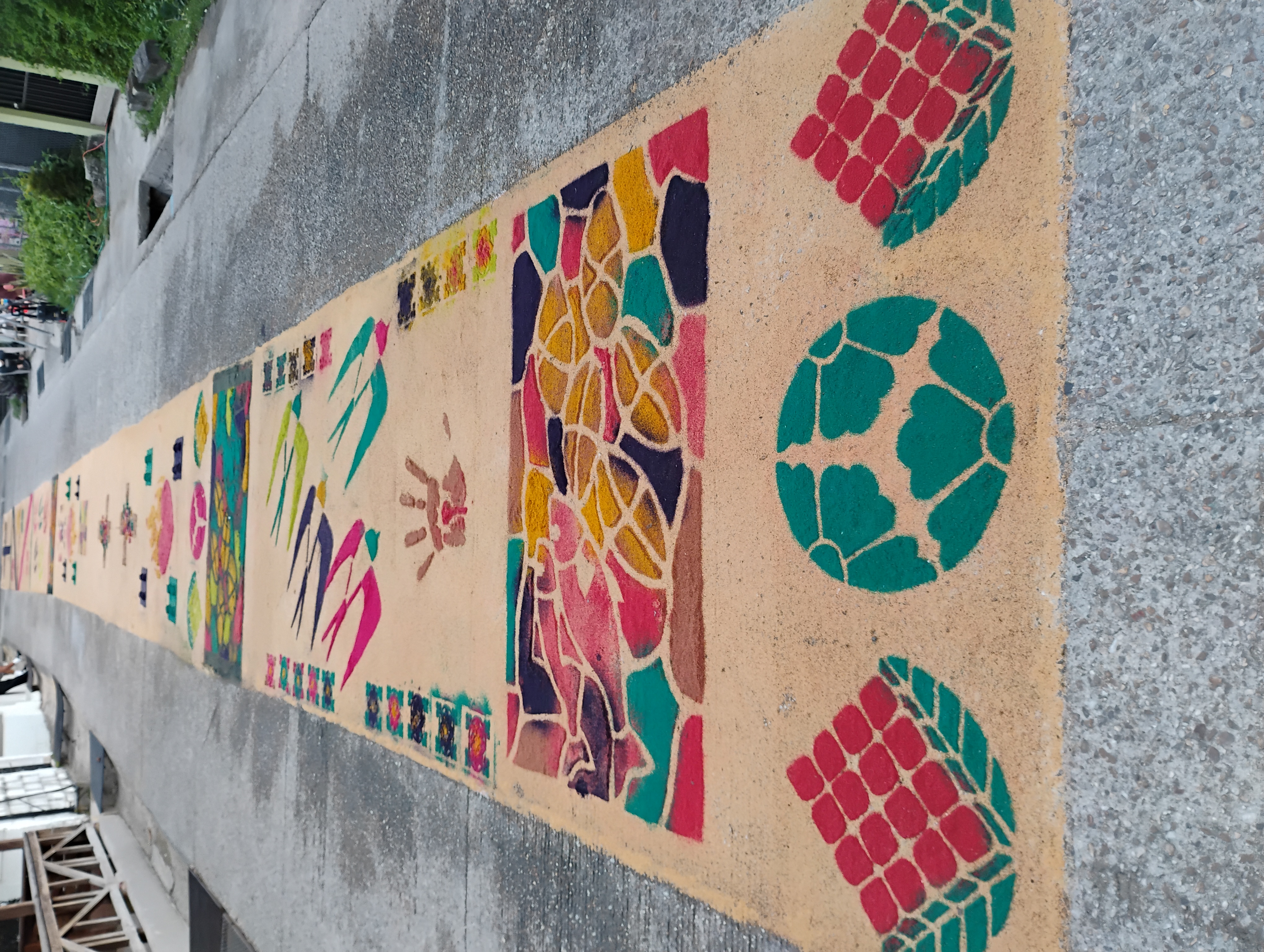 Around the same time, the student groups coordinating the creation of the tapestries or alfombras met at the House of Culture to create their elaborate stencils for 6 foot width to up to 40 feet in length tapestries, in some cases. They drew out their designs then spread out on the floor of the main community space, they went to work using utility knives to cut precise lines into thick cardboard to create their designs. Sacred Heart Junior College and the SISE Puede girls shared their design ideas as well as photos of last years phenomenal floral 40 foot design. In discussion ambition ideas emerged this year for a stained glass theme as they managed the challenges of laying out and cutting their designs.