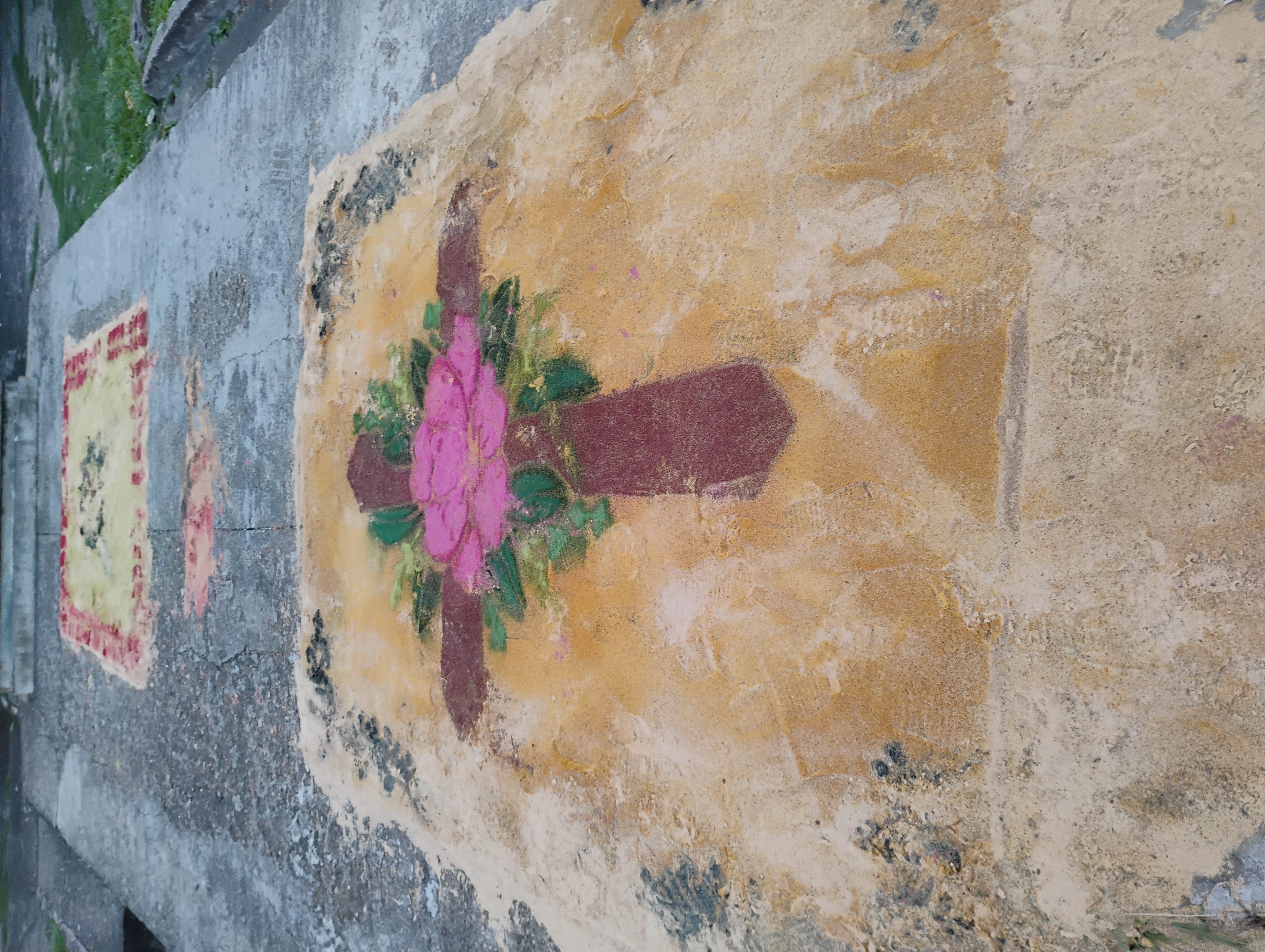In the two weeks leading up to the dyeing process, a team of volunteers coordinated in advance led by the SISE House of Culture staff. The team came together setting up tables, large buckets, boiling water, vinegar, salt and the main ingredient - dyes. The bins were filled with sawdust and then dye was added to the mix, followed by hot water with vinegar added. With rubber gloves and masks volunteers and staff folded the dye into the sawdust until well mixed then added salt as a mordant. Large flat cardboard sheets were laid out to spread the dyed sawdust to dry overnight. As the rains and winds arrived we moved all the cardboard sheets indoors as the evening approached. It was a beautiful dance of team work. Everything would be ready in time for the morning of Good Friday to begin creating the tapestries for the procession that evening.