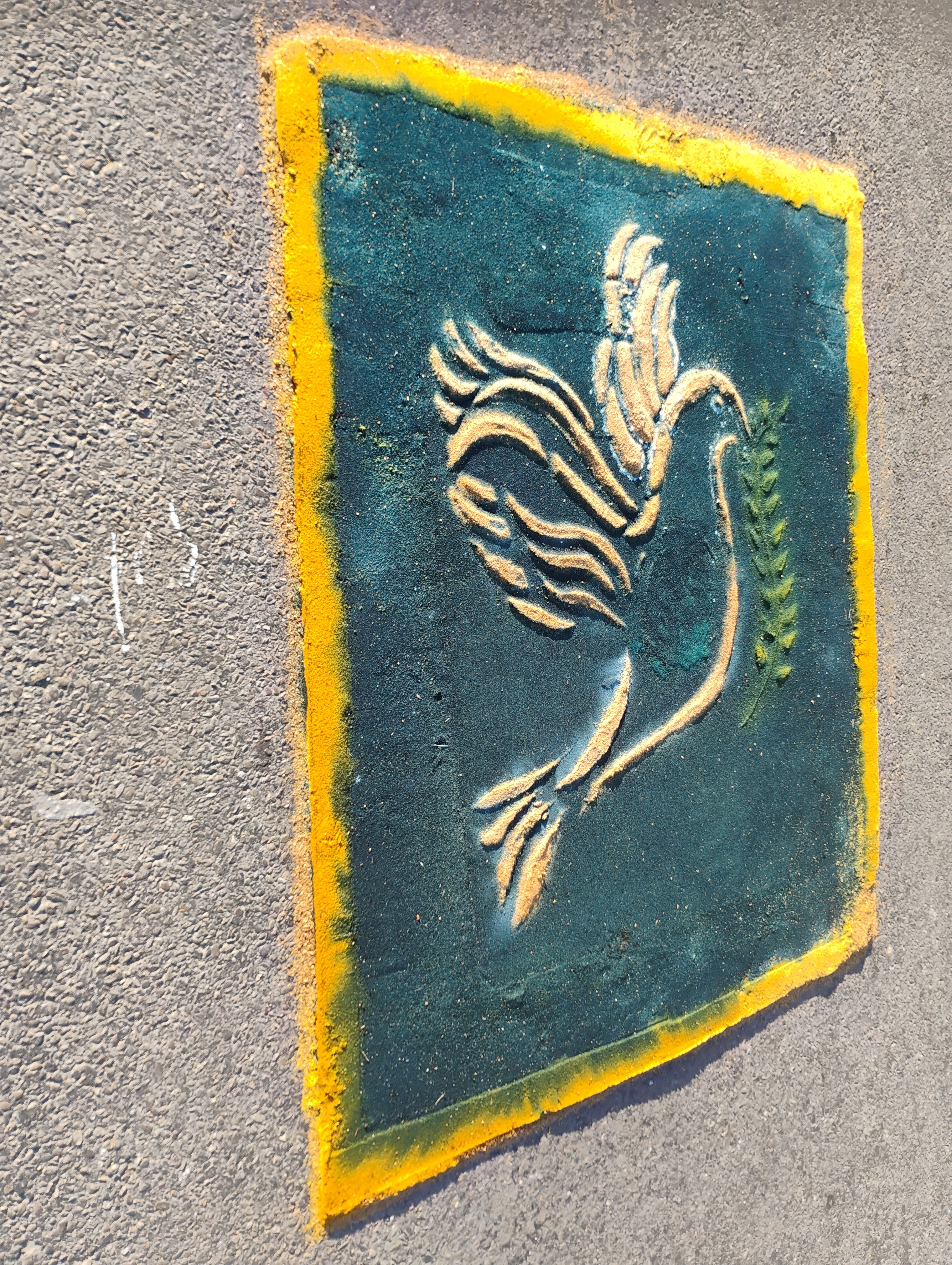 In the two weeks leading up to the dyeing process, a team of volunteers coordinated in advance led by the SISE House of Culture staff. The team came together setting up tables, large buckets, boiling water, vinegar, salt and the main ingredient - dyes. The bins were filled with sawdust and then dye was added to the mix, followed by hot water with vinegar added. With rubber gloves and masks volunteers and staff folded the dye into the sawdust until well mixed then added salt as a mordant. Large flat cardboard sheets were laid out to spread the dyed sawdust to dry overnight. As the rains and winds arrived we moved all the cardboard sheets indoors as the evening approached. It was a beautiful dance of team work. Everything would be ready in time for the morning of Good Friday to begin creating the tapestries for the procession that evening.