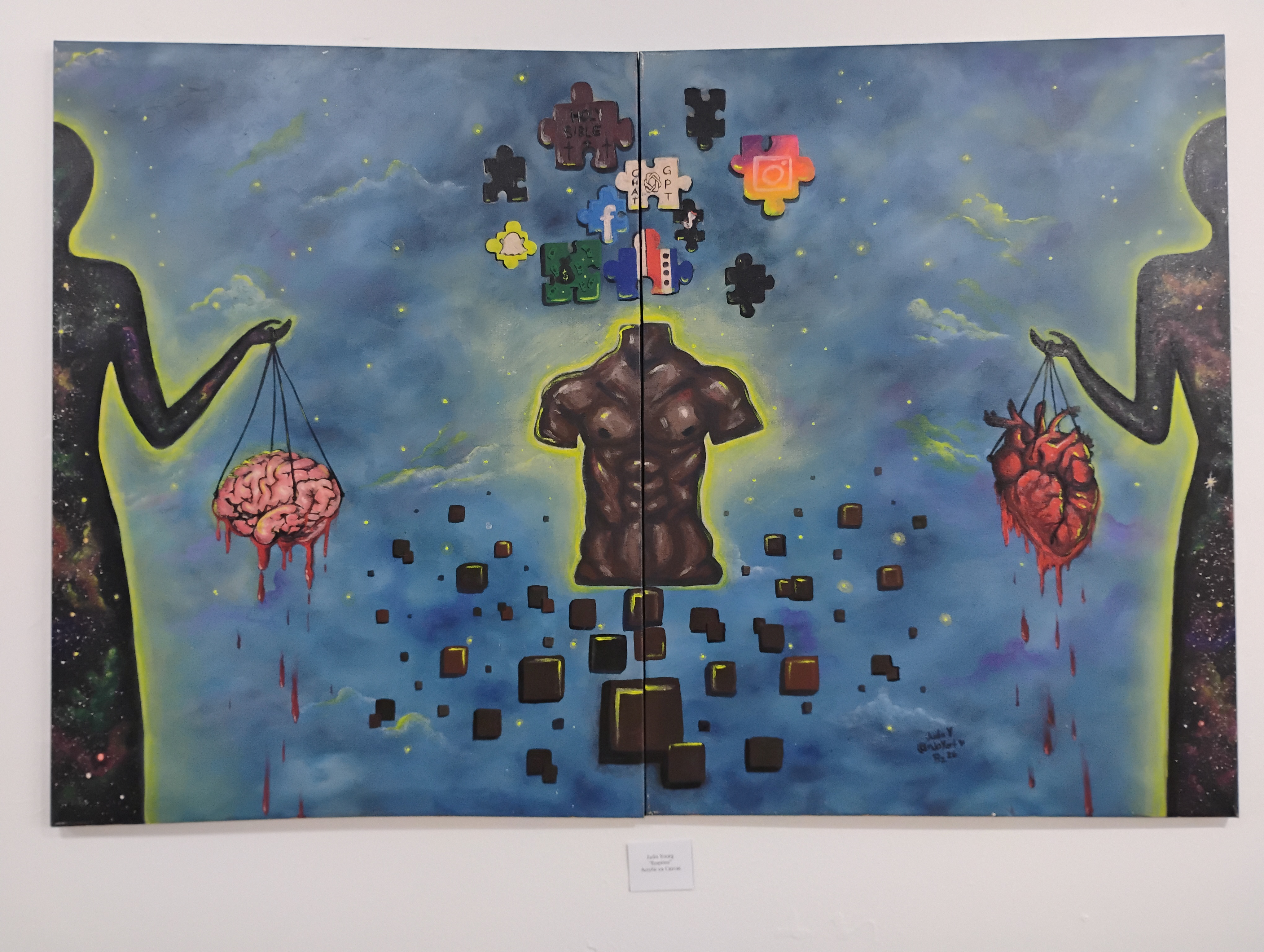 Another work included, "Empress" by Judia Young, is a celestial painting of Woman (Empress) centered as a silhouette balancing both heart and brain - as if on the scales of justice while a romanesque bust of a man is displayed with relatively smaller with puzzle pieces featuring social media companies, bag of $, and the bible. The landscape is peppered with black matter cubes underscoring the scene almost like landmines in full view. This is the title art for the accompanying literary magazine. What we noticed between the installed art and the publication is that this work can be installed in two totally different ways as a diptych which changes whether the man or woman is centered in the artwork- noticeably skewing the interpretation.